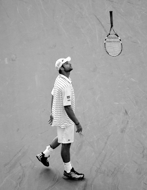← 9月28日,罗迪克在中网决赛中因失误扔掉球拍。 新华社发