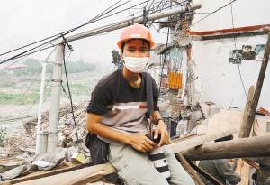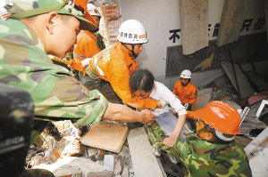 | ←省消防总队战士郑阳武在抗震救灾前线解救受困群众。 (资料图片) |