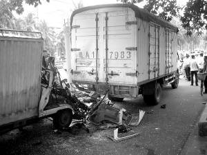 事发现场在龙昆北路。一辆车牌号为琼C51779的白色小货车越过路旁的花圃,追尾撞上在自行车道上的车牌为琼A17983的厢式货车。白色小货车车头严重变形(见左图,林伟摄),有4人被困在白色小货车副驾驶室。后经120医生鉴定,其中,一男一女已经当场死亡,另2人受重伤。