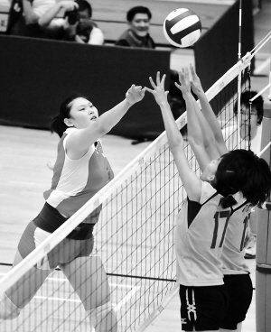 | 10月9日,中国女排在香港青衣体育馆与香港女排进行了一场友谊赛。图为国家女排队员王一梅(左)与香港女排队员在网上争夺。 新华社发 |