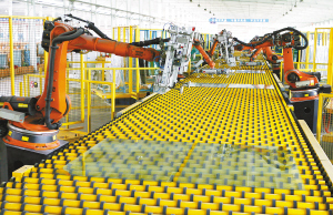| → 10月10日,福耀海南浮法玻璃有限公司的生产线上,全自动控制的机器手正在装卸成品玻璃。