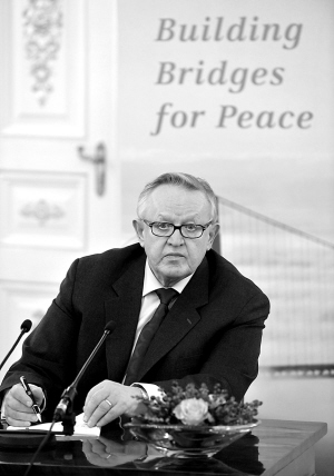 | 10月10日,芬兰前总统马尔蒂·阿赫蒂萨里在首都赫尔辛基出席新闻发布会。