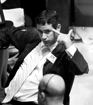 10月9日,一名交易员在美国纽约股票交易所工作时作手势。 新华社/法新