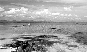 人们总是说大海无边无际,但是我自己亲眼看见的海却是有边际的,只是海的边际颜色与天空的颜色融合在一起,让你充分地体验到你就是佛界中人,能够感受天地万物间的美与纯,正如佛家所说的净。当我站在观音的脚下,看见海水是深蓝色的,在不远处,就有一种很强烈的颜色将海水分出界限,并且更远之处的海水又是与天空之色相融合。刹那间,我极想纵身海中,与海相拥,回归大自然的怀抱。海水的声音极其特别,无论你怀着什么样的心情倾听,你都能感受到它给你带来的与众不同,更能让你有所感悟。