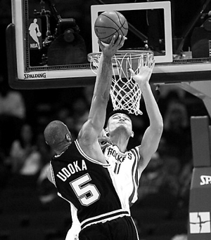 | 姚明防守马刺队乌多卡多篮下进攻。小新发