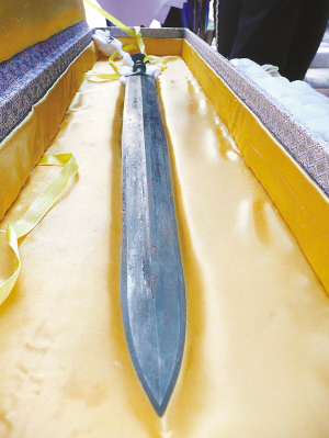 | 省长罗保铭(左)和国家文物局局长单霁翔共同展示越王亓北古剑。 本报记者 陈成智 摄 |