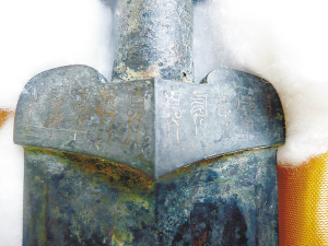 记者在现场看到,剑身通体散发冷光,刃口锋利,斜宽从厚格式,中脊起线,两从斜弧,双刃呈弧形于近锋处收狭,喇叭形素面剑首,茎为柱形,茎上有平行箍2道,上有错金纹饰,剑首环铭及剑格铭文共计32个字,全部为错金鸟虫书篆体,历经2400年风风雨雨,铭文依然清晰可辨,色彩鲜明。