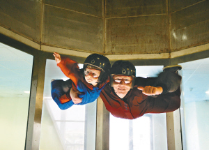 10月11日,在阿联酋首都阿布扎比的太空娱乐风洞,克里斯·格雷(右)和自己的女儿一起享受室内“飞翔”的乐趣。这个中东地区首个太空娱乐风洞高7米,直径3.5米,自下向上的风速达到每小时150公里,可以让顾客在室内体验空中飞翔的感觉。 新华社/路透