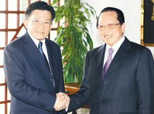 | 10月13日,柬埔寨外交大臣贺南洪(右)与泰国外长颂蓬·阿蒙维瓦在柬埔寨首都金边进行会谈时握手。当天,泰国和柬埔寨就两国边境冲突问题恢复会谈。 新华社/法新 |