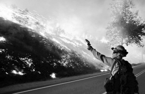 一名洛杉矶消防员开枪制造逆火,将即将到来的大火通道区域烧光。新华社/路透