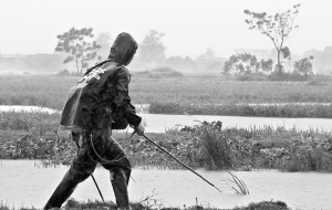 雨中电鱼 险! 10月13日,在海口市琼州大桥附近,一名男子背着自制电鱼机沿田边电鱼。 据附近村民介绍,以前有过电鱼时脚下打滑掉进水中被电击致死的惨剧发生。村民希望通过本报提醒电鱼者勿忘安全。 本报记者 李英挺 摄