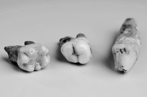 省博物馆馆藏文物———三亚落笔洞人类牙齿化石。
