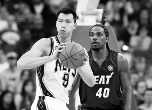 10月12日,在英国伦敦进行的NBA季前赛的一场比赛中,网队以94比92战胜热火队。图为网队球员易建联(左)在热火队球员哈斯勒姆的防守下传球。 新华社发