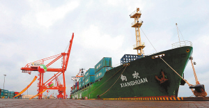 | 10月13日下午,国投洋浦港码头,“向欢号”即将首航洋浦———华东地区航线。 本报记者 王军 摄 |