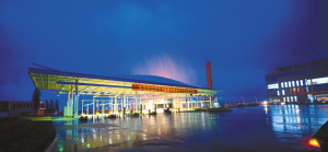 | 暮色中的洋浦保税港区卡口。 本报记者 王军 摄 |