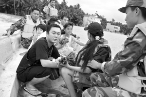 | 10月13日,文昌市文城镇官坡村,文昌边防支队的战士正在把受灾群众转移到安全地带。持续的暴雨使该村的30多户100多位村民被洪水围困。 本报记者 王凯 摄 |