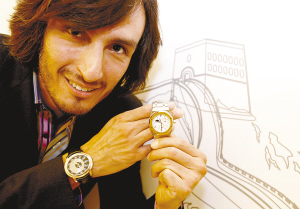 10月13日,世界著名腕表设计师Octzvio Garcia展示特意为中国设计的名为“为中国骄傲”的腕表。当日,世界著名瑞士钟表生产厂家———爱彼表公司在北京举行发布会,宣布为庆贺北京成功举办第29届奥运会,该公司将向中国市场投放一款限量发行的腕表。设计师Octzvio Garcia以中国长城图案为灵感,设计了这款名为“为中国骄傲”的腕表。 新华社记者 陈建力 摄