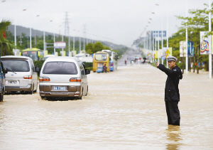 | 10月13日,三亚街头,一名交警站在积水中指挥车辆通行。