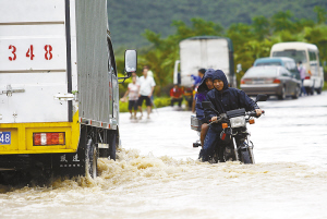 | 10月13日,三亚亚龙湾路口,暴雨积水导致车辆通行困难。 本报记者 宋国强 摄 |