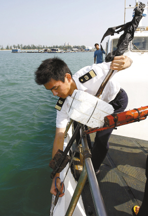 10月15日,洋浦海事执法人员在清理洋浦港航道上的渔网。 针对洋浦港大型船舶、超规范船舶进出较多的特点,洋浦海事局加强巡航检查,以维护良好的通航秩序。本报记者 宋国强 摄