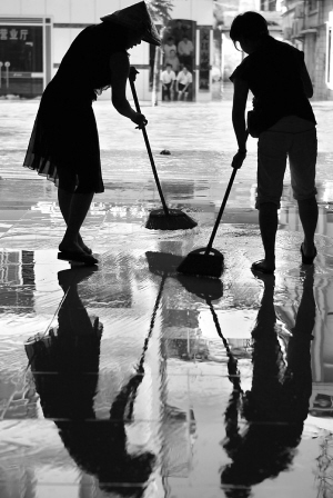 | ↑10月15日,文昌市文南街的商铺店主正在清扫洪水退去后留下的泥沙准备开业。 本报记者 王凯 摄 |