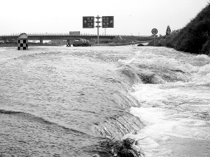 湍急的水流急涌而下,漫过高速路面,从立交桥上往下看,半圆形的匝道旁变成了水塘。这是记者15日上午11时在东线高速与海口绕城高速相交的龙桥立交目击的镜头。省公路管理局局长助理、总工阳振中在察看现场后认为,三大原因导致龙桥立交排水不畅。首先,龙桥立交地势较低,高处的水源往立交下泄,汇水面较大。其二,除匝道立交的积水外,至今高处还有急下的来水不断补充,且来水量远远大于排水量。另一个重要原因是龙桥立交的排水系统不尽完善,主干道的边沟涵管孔径不足,导致排水不畅。 本报记者 侯小健 摄影报道
