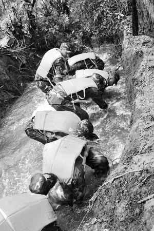 官兵们冒着瓢泼的大雨,跳进汹涌翻滚的洪水,开挖导流渠、抢筑子堤、搬运沙石,给水库岸堤减少压力。2个多小时过去,险情排除,官兵们长长地舒了一口气,前来助阵的群众一颗悬着的心也终于放了下来。