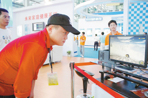 10月15日,一名参观者在高交会上试戴“神奇帽子”操纵屏幕上的企鹅。 在深圳举行的第十届中国国际高新技术成果交易会上,中国科学院深圳先进技术研究院展出的“神奇帽子”吸引很多参观者。它运用光电传感和运动传感技术,戴帽子的人只要轻轻摆动脑袋,屏幕上的企鹅就会按照脑袋摆动的方向前进。戴上帽子不用动手,也能随心所欲操纵屏幕上的小企鹅。 新华社记者 吴俊 摄