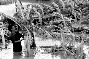 图为塔洋镇群众正在香蕉园里清渠排除积水。 特约记者 蒙钟德 摄