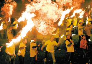 10月15日,在荷兰艾恩德霍芬,科技大学的267名学生参加集体喷火活动。这些学生当天尝试打破原先为115人共同创造的集体喷火吉尼斯世界纪录。 新华社/法新