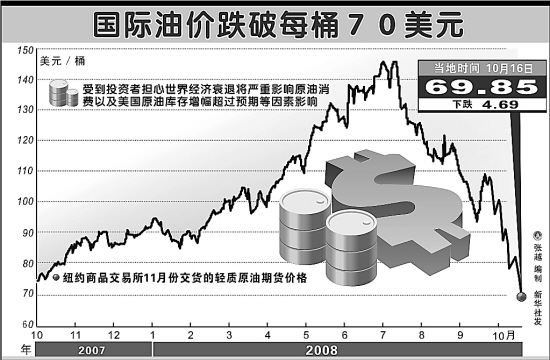 国际油价跌破每桶70美元