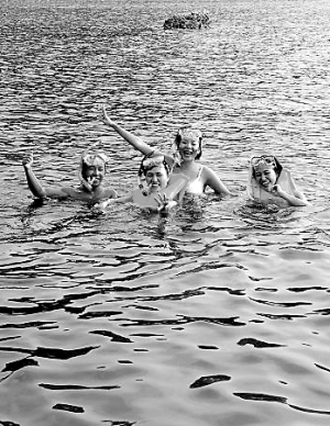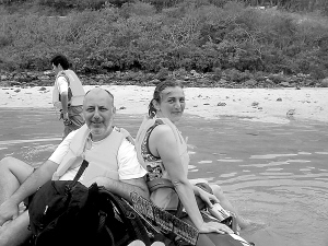 | ↑ 陪游人士“小漆”(图左)陪伴游客在锦母角潜水。 本报记者 程范淦 摄 |