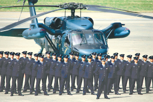 10月19日,日本自卫队官兵及直升机在航空自卫队位于茨城县的百里基地接受检阅。当天,日本陆、海、航空自卫队在百里基地举行三年一度的航空阅兵式,包括F-15、F-2等机型在内的82架飞机及约5000名官兵参加了此次阅兵式,日本首相麻生太郎参加检阅并发表讲话。 新华社记者 任正来 摄