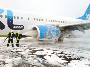 10月18日,在塞尔维亚的贝尔格莱德机场,消防员向飞机引擎喷洒泡沫。当天,一架从德国飞往土耳其的波音737-800型客机由于引擎故障紧急迫降在贝尔格莱德机场。机上载有169人,包括163名乘客和6名机组人员。飞机迫降时一个引擎冒烟。 新华社/路透