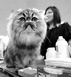 10月18日,在美国纽约举行的爱猫者协会选美大赛上,一只虎斑波斯猫坐在自己的大堆“化妆品”旁边,准备出场亮相。今年的爱猫者协会选美大赛这个周末在纽约的麦迪逊广场花园举行。 新华社/路透