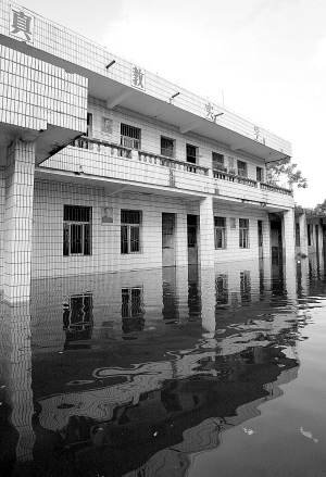 | 10月20日,龙洪小学的教学楼还泡在水里。 本报记者 林萌 摄 |