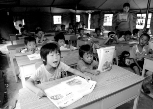 村民王桂妹开心地告诉记者,跟原来的教学楼相比,这些帐篷虽然显得有些矮小,但毕竟学校又开课了,家里的小孩又上学了,她一直悬着的心也终于放下了。