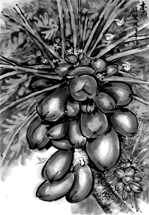记者在展出现场看到,林明贤的写意国画,无论是热带水果、海底世界、乡村风光等,在色调的应用和笔触运行方面,力求自然、清秀,对形象的准确把握令人叫绝,真所谓“目之所见,志之以笔”,尽显扎实的传统功底。展出的“热带水果”系列,如可可、菠萝蜜、芭蕉、无花果、椰子等,构图充盈,笔触细密,朴素中见绚烂,用色稳重中不失清逸。举凡海南的山间野果、常见瓜果,除却对实物形状、色彩、光影的描绘,鲜嫩欲滴,意象清新,还追求视觉意趣和“笔墨”韵味。