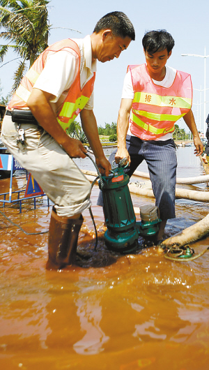 左图:粤海大道积水处,排水工人用抽水机进行应急排水。 本报记者 李英挺 摄