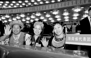 海南代表团的工会代表在中国工会十五大会议间隙合影留念(10月19日摄) 。
