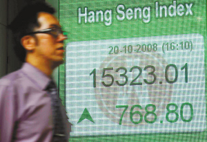 | 10月20日,一名市民在香港中环一家银行的恒生指数电子显示屏前走过。