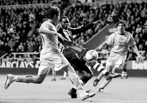 | 10月21日,在英超联赛第八轮比赛中,曼城队客场以2:2与纽卡斯尔联队战平。图为纽卡斯尔联队球员阿梅奥(左)射门。 新华社发 |
