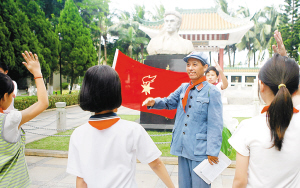本报海口10月21日讯 (记者苏建强)56岁的四川退休老人张朝锋,走遍7省市,行程上万公里,走访了多个苏维埃革命根据地,收集红军素材,欲撰写长篇章回体小说《红军》。今天,张朝锋在海口李硕勋烈士塑像前为少先队员上革命教育课。