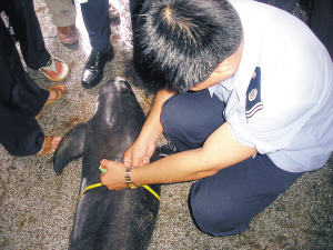 | 渔业监察人员给海豚测量胸围。 本报记者 林伟 摄