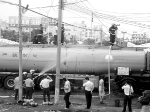 | 油罐车爆炸事故处理现场。 本报记者 林伟 摄 |
