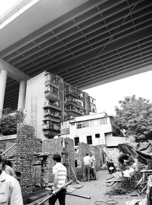 立交桥下,晒不到太阳淋不到雨 重庆“最牛楼房”旁 又建新房 10月22日,工人在“最牛的楼房”旁建新房。 重庆渝黔高速路南山立交桥下有一幢6层居民楼,楼顶大桥,状如嵌在桥下,在网上被称为“终年晒不到太阳、淋不到雨的最牛的楼房”。前不久,该楼房边又盖起了新楼房,引起不少市民的关注。 新华社记者 周衡义摄