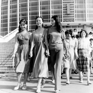 上世纪70年代的绿军装、中山装、工装,80年代的喇叭裤、蝙蝠衫、健美裤,90年代的文化衫、校服,直至进入新世纪以来的时尚服装和2008年“汶川大地震”后的红心T恤……10月19日,在北京市大红门新世纪服装商贸城内,这些代表着改革开放30年来的经典服饰重新出现在市民的视野中,这家商贸城的职工们身穿代表不同年代的“时髦衣服”,进行了“‘穿’越30年”行为艺术展示。