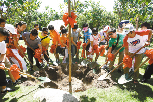 | 10月22日,奥运冠军们在南山景区共同种下一棵菩提树。 本报记者 王凯 摄 |