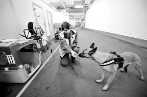 工作人员正在试图让一只小狗钻进它的“包厢”。从小小的虫子到庞大的河马,占地3750平方米的法兰克福机场动物候机厅能让它们飞向世界各地。新华社/法新