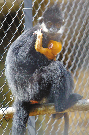 10月23日上午,出生10天的雄性黑叶猴幼仔开始在海口金牛岭动物园的圈舍里,被母猴抱着与观众见面。 据动物园饲养人员介绍,黑叶猴在海口金牛岭动物园还是头一次通过自然交配成功产仔,在我省也是第一次。 黑叶猴是珍贵稀有灵长类动物之一,仅产于广西、贵州,数量很少,以植物性食物为主,属我国一级保护动物。 本报记者 古 月 摄影报道